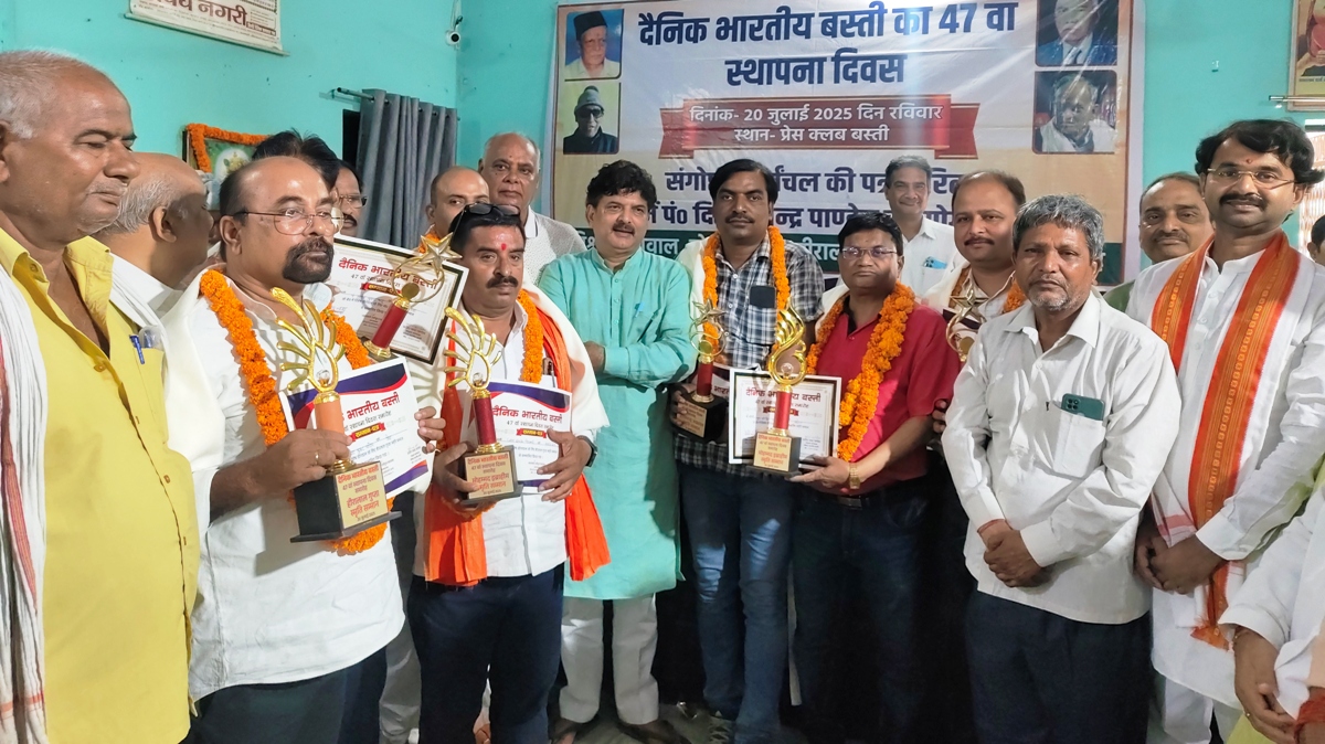 बस्ती। दैनिक भारतीय बस्ती का 47 वां स्थापना दिवस प्रेस क्लब सभागार में संकल्पों के साथ मनाया गया। इस अवसर पर डा. वी.के. वर्मा, अजय कुमार पाण्डेय, कृष्णदेव मिश्र, सज्जाद रिजवी, राजेश कुमार पाण्डेय ’गांधियन, सुनील कुमार भट्ट, वीरेन्द्र गोस्वामी, देवेन्द्र पाण्डेय, विवेक कुमार मिश्र, जय प्रकाश गोस्वामी, राजेश कुमार पाण्डेय, को हरिश्चन्द्र अग्रवाल, मो. इब्राहिम, हीरालाल गुप्ता स्मृति सम्मान से अतिथियों द्वारा सम्मानित किया गया।
